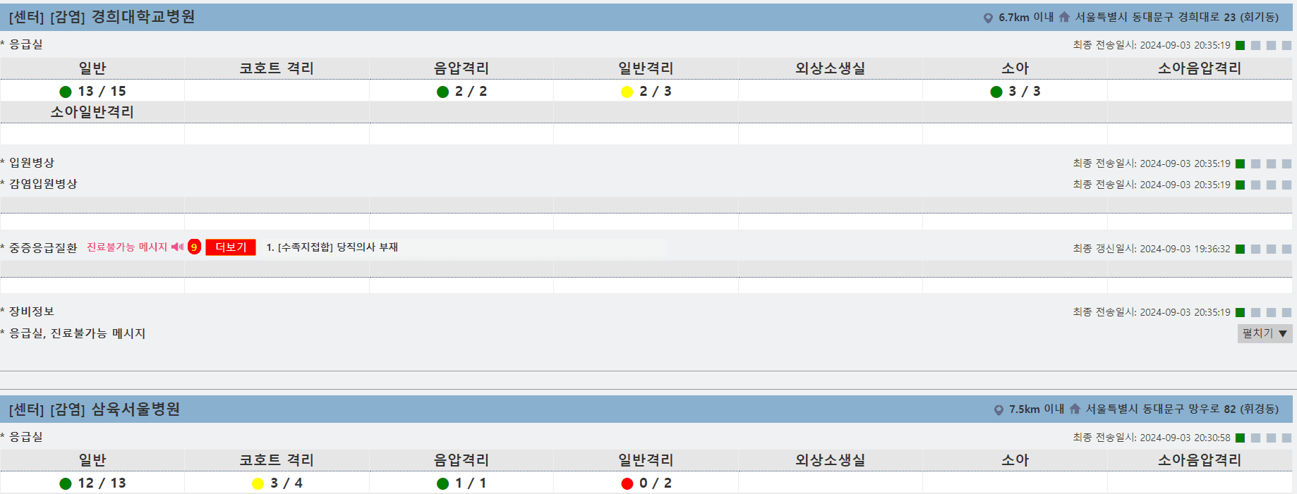 자신이 살고 있는 시와 구/읍/면/동 등을 입력하고 전체적인 가용병상수, 응급실 일방/소아 등에 관한 정보를 얻을 수 있습니다. 또한 세부적으로 현재 심근경색인지 혹은 소아환자 등에 따라 세부 입원병상을 선택할 수 있습니다.